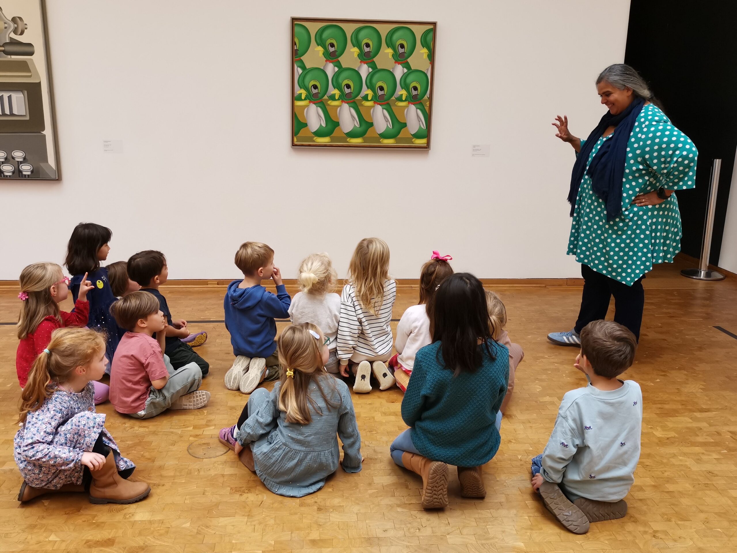 In einem Werk von Bruno Goller entdecken sie tatsächlich eine gemalte Katze – und jubeln, als hätten sie sie selbst gefunden. Ein Bild von Christa Dichgans mit zehn grünen Enten sorgt für konzentriertes Zählen: Ganz genau hinschauen lohnt sich.