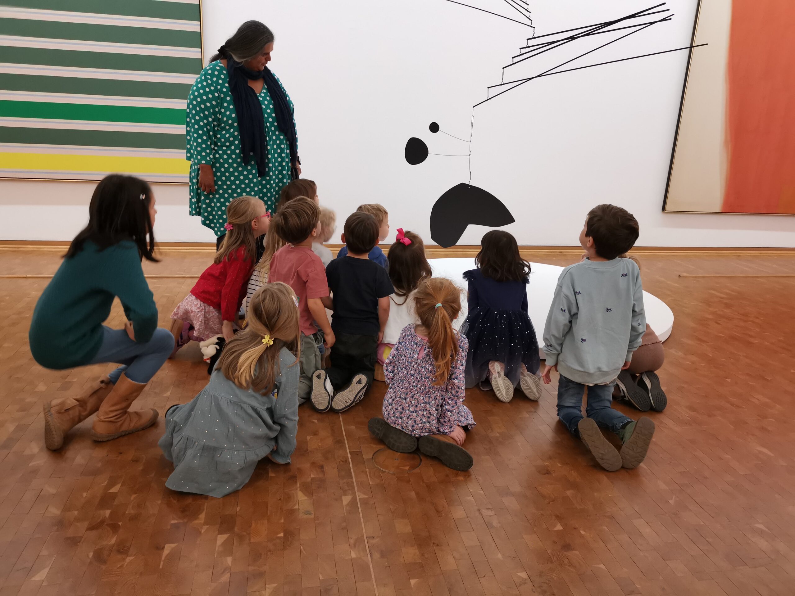 Zum Abschluss versammeln sich alle vor dem großen Mobile von Alexander Calder. Mira lädt die Kinder ein, gemeinsam zu pusten – und tatsächlich, das Kunstwerk beginnt sich sacht zu drehen. Ein stiller, fast magischer Moment.
