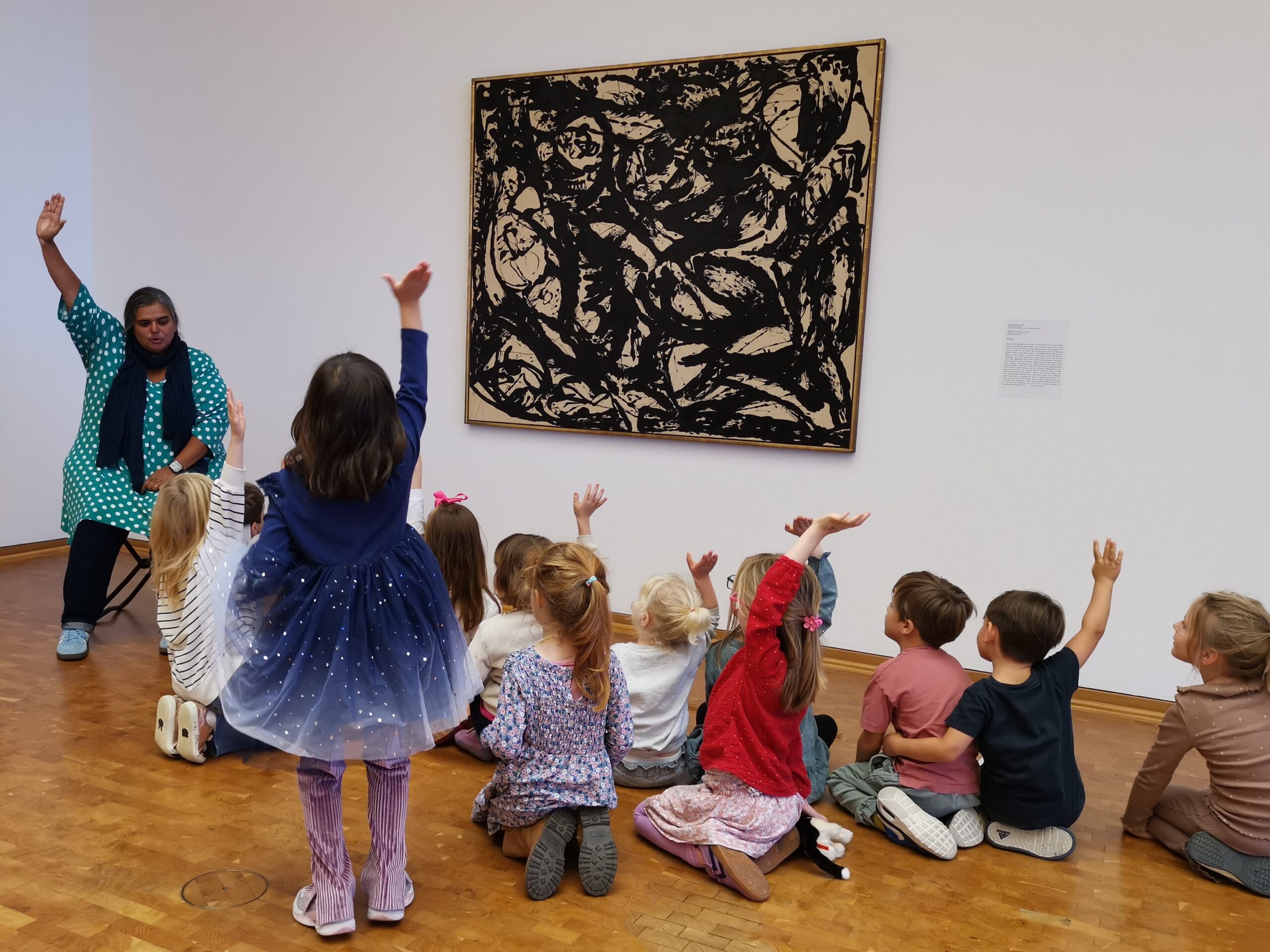 Dann wird’s aktiv: Mira zeigt, wie Jackson Pollock malte – nicht mit feinem Pinselstrich, sondern mit Schwung, Tropfen und Bewegung. Die Kinder schwingen imaginär ihre Pinsel durch die Luft und haben sofort verstanden, warum das „Actionpainting“ heißt.