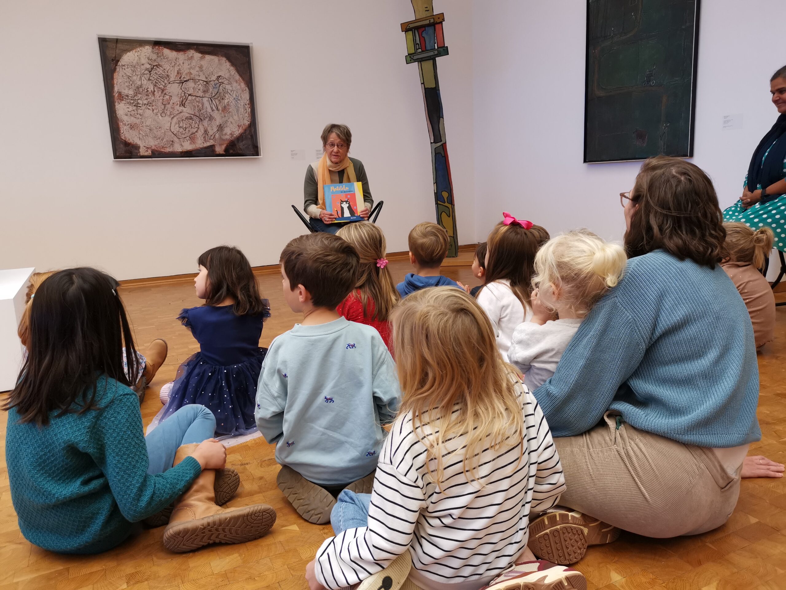 Gespannt lauschen die Kinder der Geschichte: Mathilda schläft tagsüber und streift nachts durch das Museum – auf leisen Pfoten, zwischen den großen Werken berühmter Künstlerinnen und Künstler. Doch keins der Werke stammt von einer Katze! „Wie wird man denn Künstler?“, fragt Susa in die Runde. „Man muss üben!“, ruft eine kleine Zuhörerin mit fester Stimme – und bringt damit die Sache auf den Punkt.
