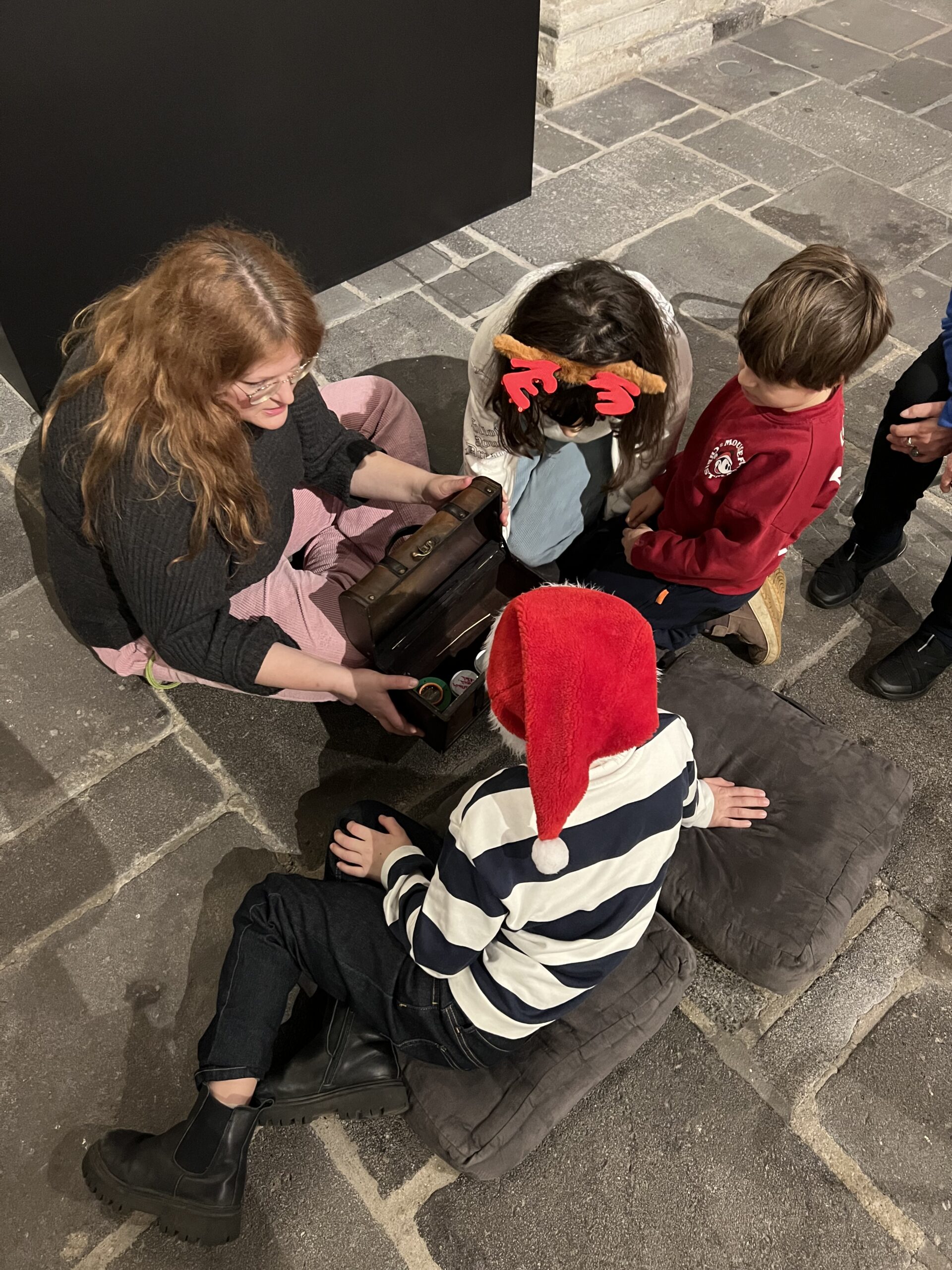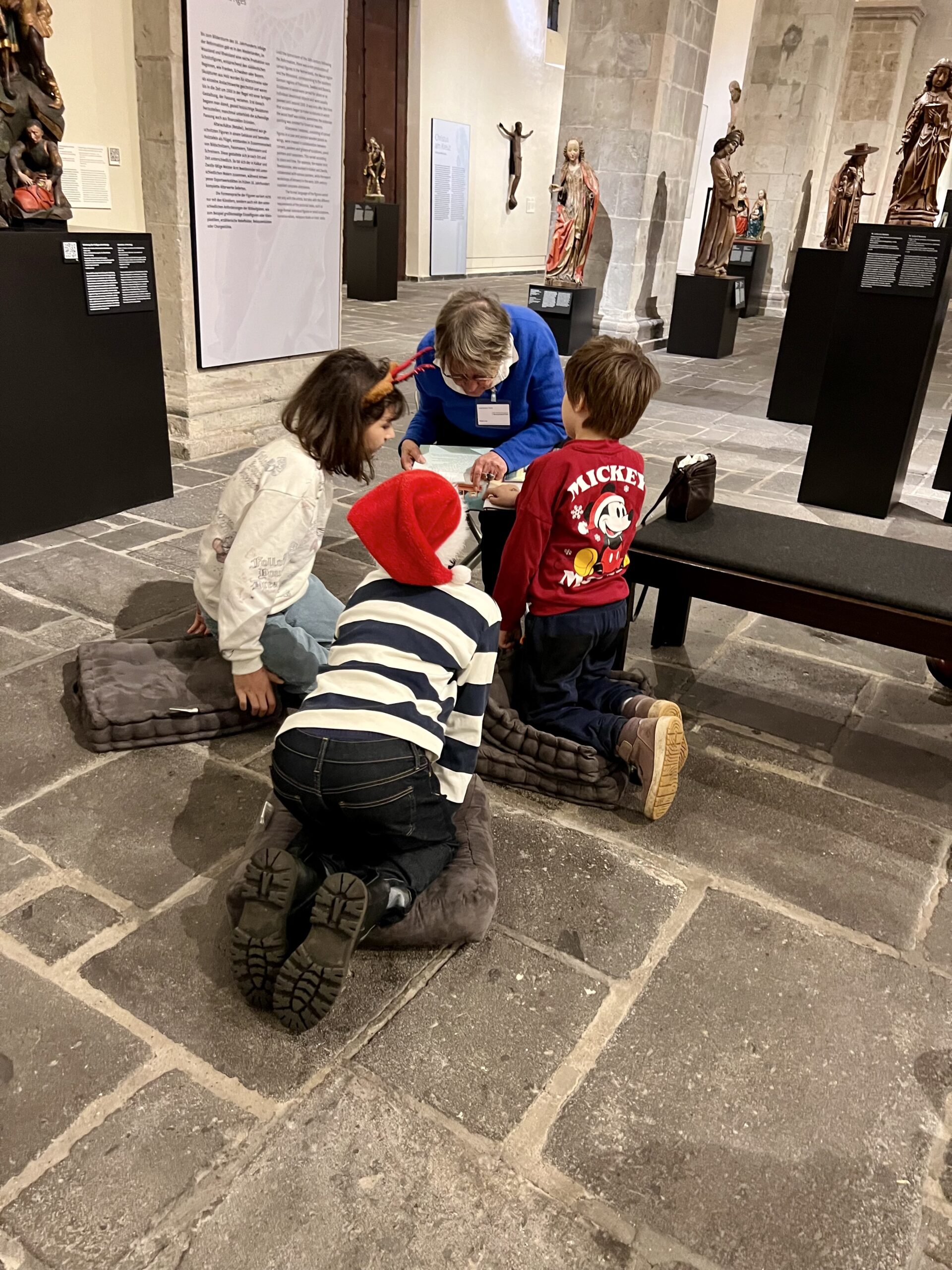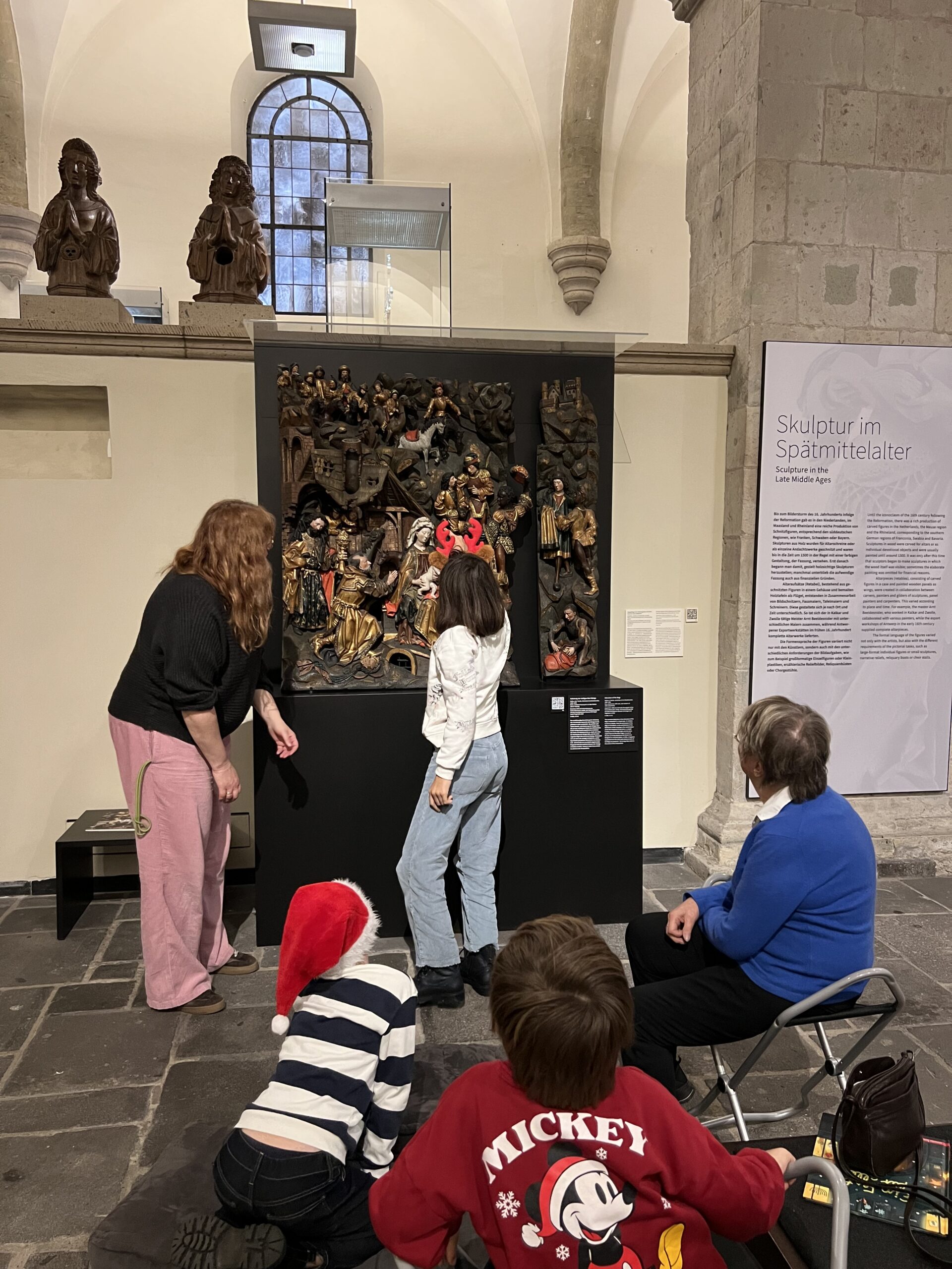 Nach dem Vorlesen erwartete die Kinder ein spannender Museumsimpuls. Museumspädagogin Christina Clever-Kümper zeigte uns das eindrucksvolle Dreikönigenrelief von Meister Arnt (um 1480). Anschließend öffnete sie eine geheimnisvolle Holzkiste mit drei kleinen Gläsern darin – jedes gefüllt mit einem Duft, den es zu erraten galt. Welche Gerüche wohl durch das Museum zogen?