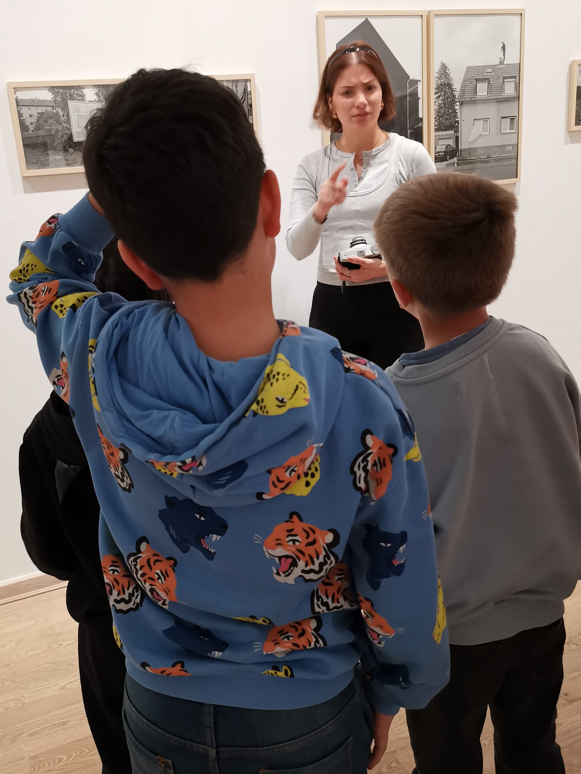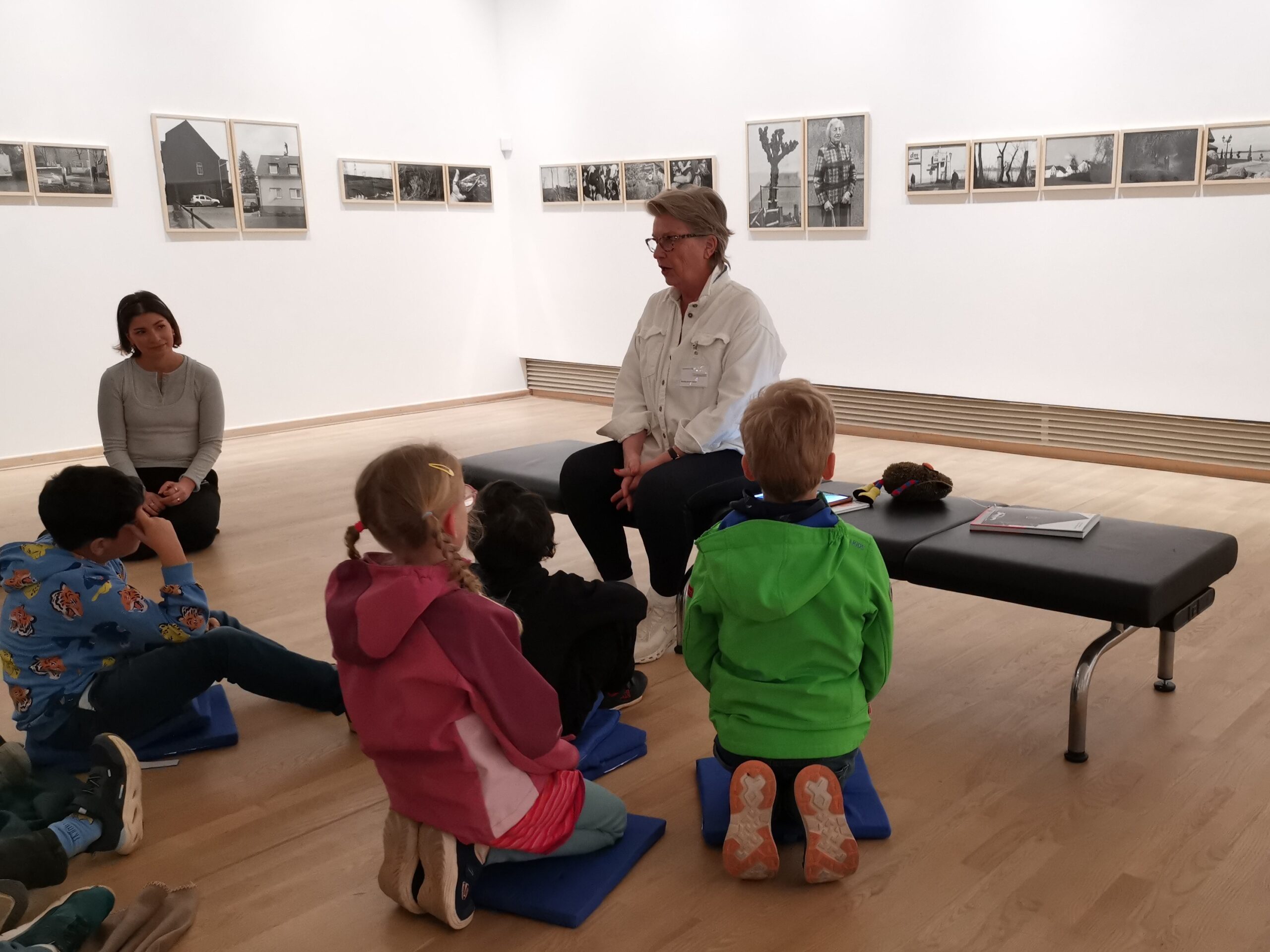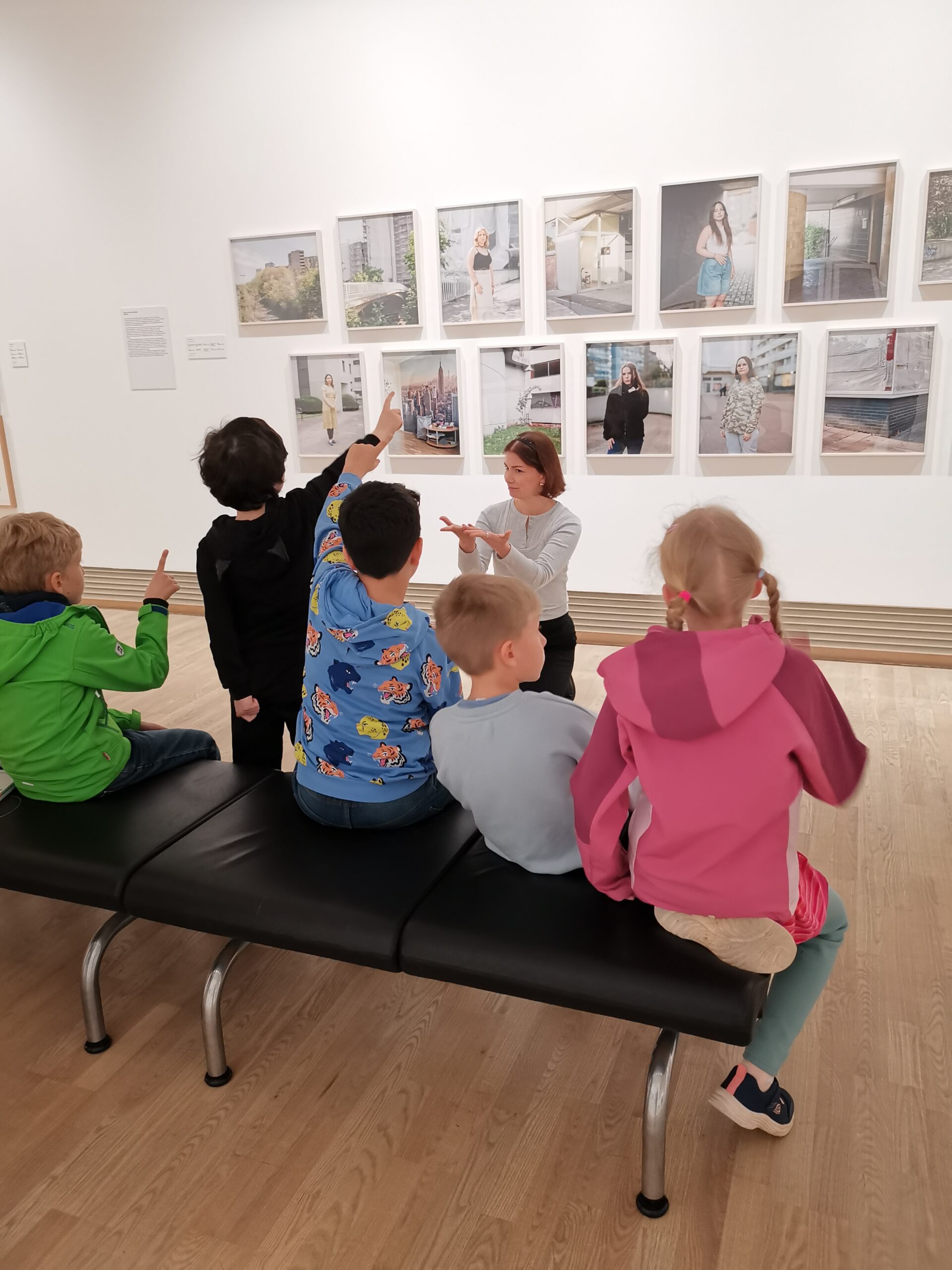 Im Anschluss knüpft Museumspädagogin Didem Tuncer direkt an die Geschichte an. Mit dem Museumsmaskottchen Hase Pixel geht es um die Frage: Was ist eigentlich ein Lebensraum? In der Ausstellung „Lebensräume – zeitgenössische Perspektiven“ entdecken die Kinder, dass nicht nur die Menschen auf den Fotos wichtig sind, sondern auch ihre Umgebung.