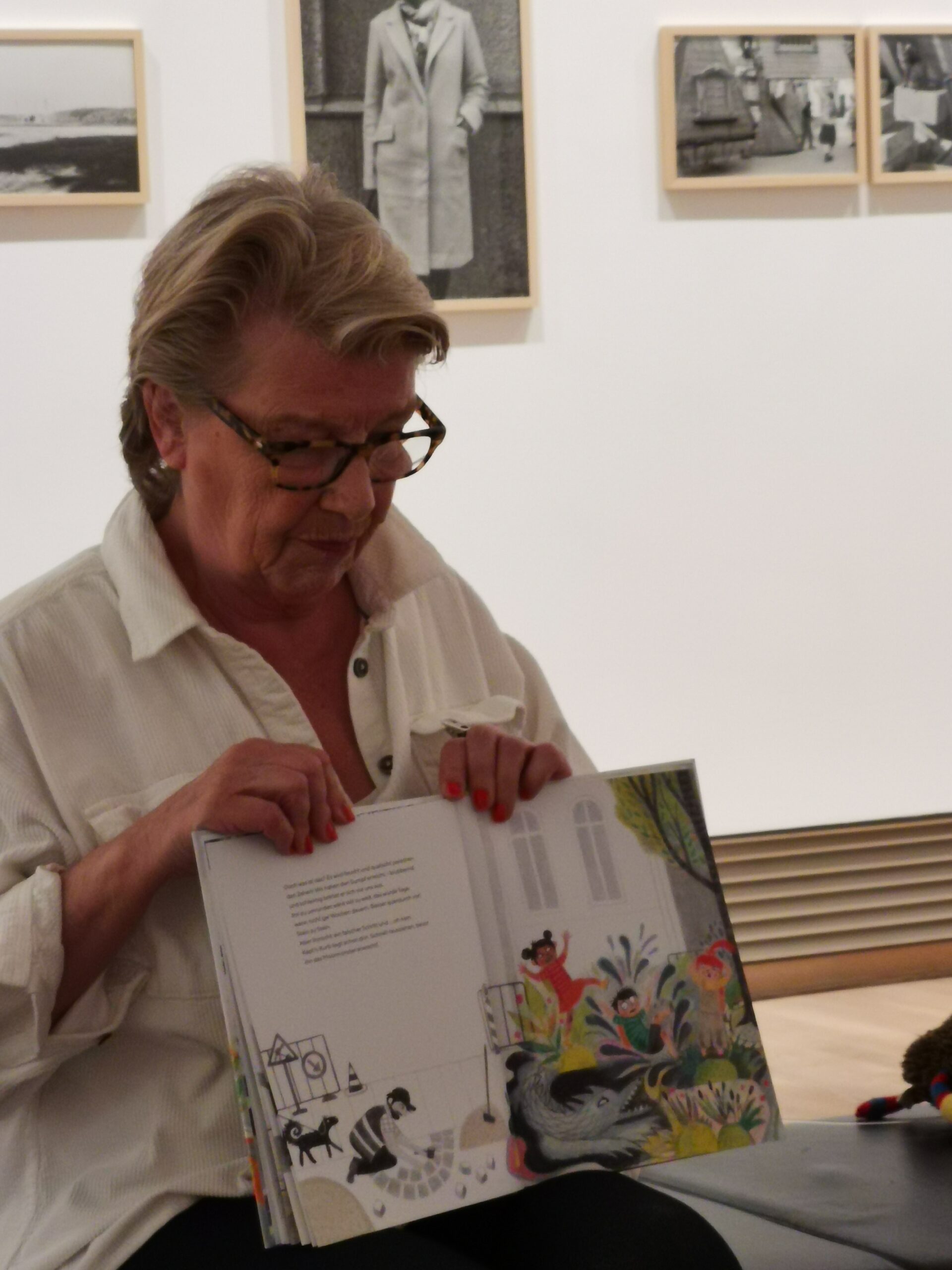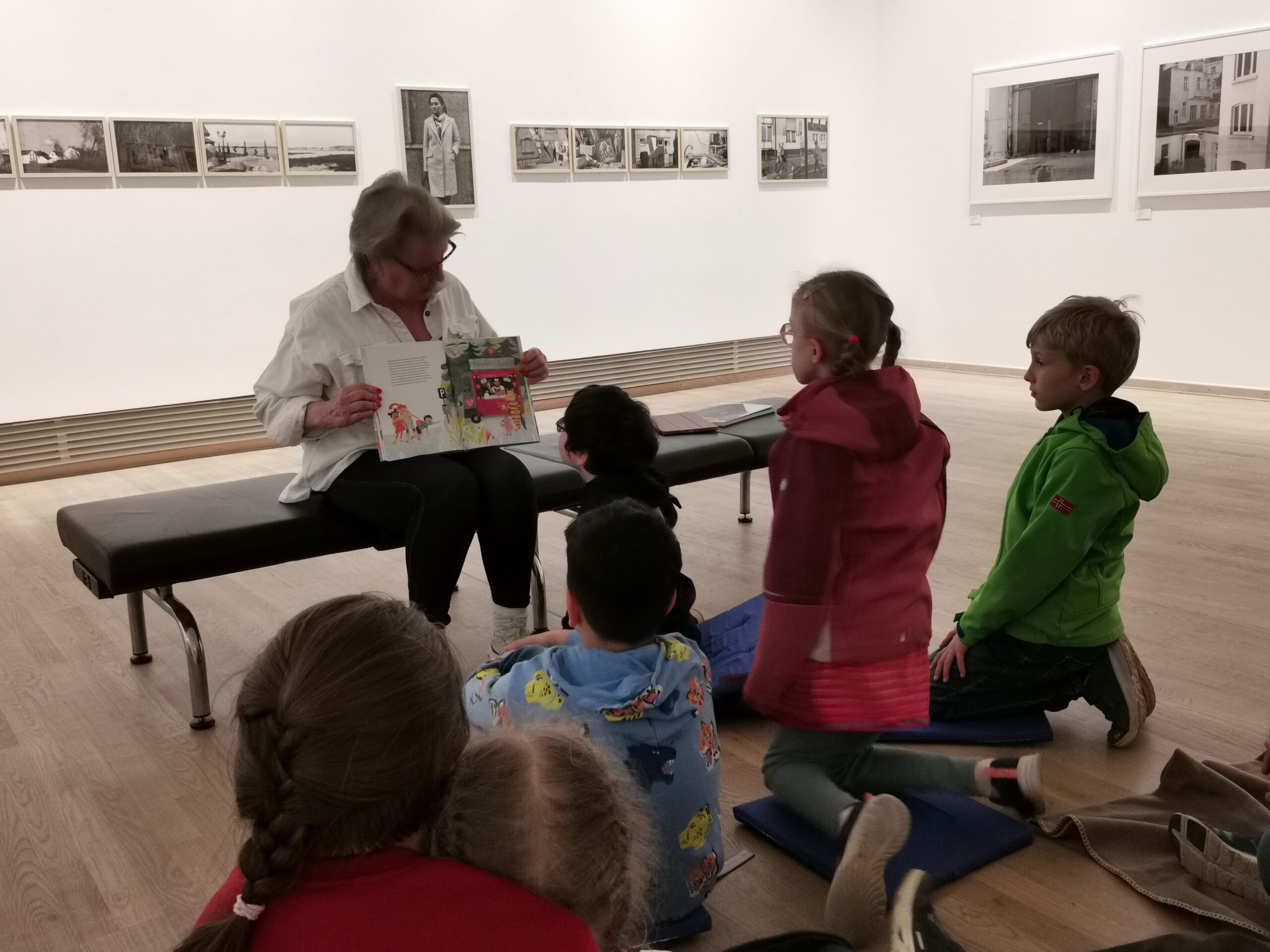 Ein Samstagnachmittag in der Photographischen Sammlung SK Stiftung Kultur: Sieben Kinder und ihre Begleitpersonen haben es sich in den Ausstellungsräumen gemütlich gemacht und hören aufmerksam zu, als unsere ehrenamtliche LeseWelten-Vorleserin Martina Siems-Dahle vorliest aus „Wir sind ja nicht aus Zucker“ von Leonora Leitl.